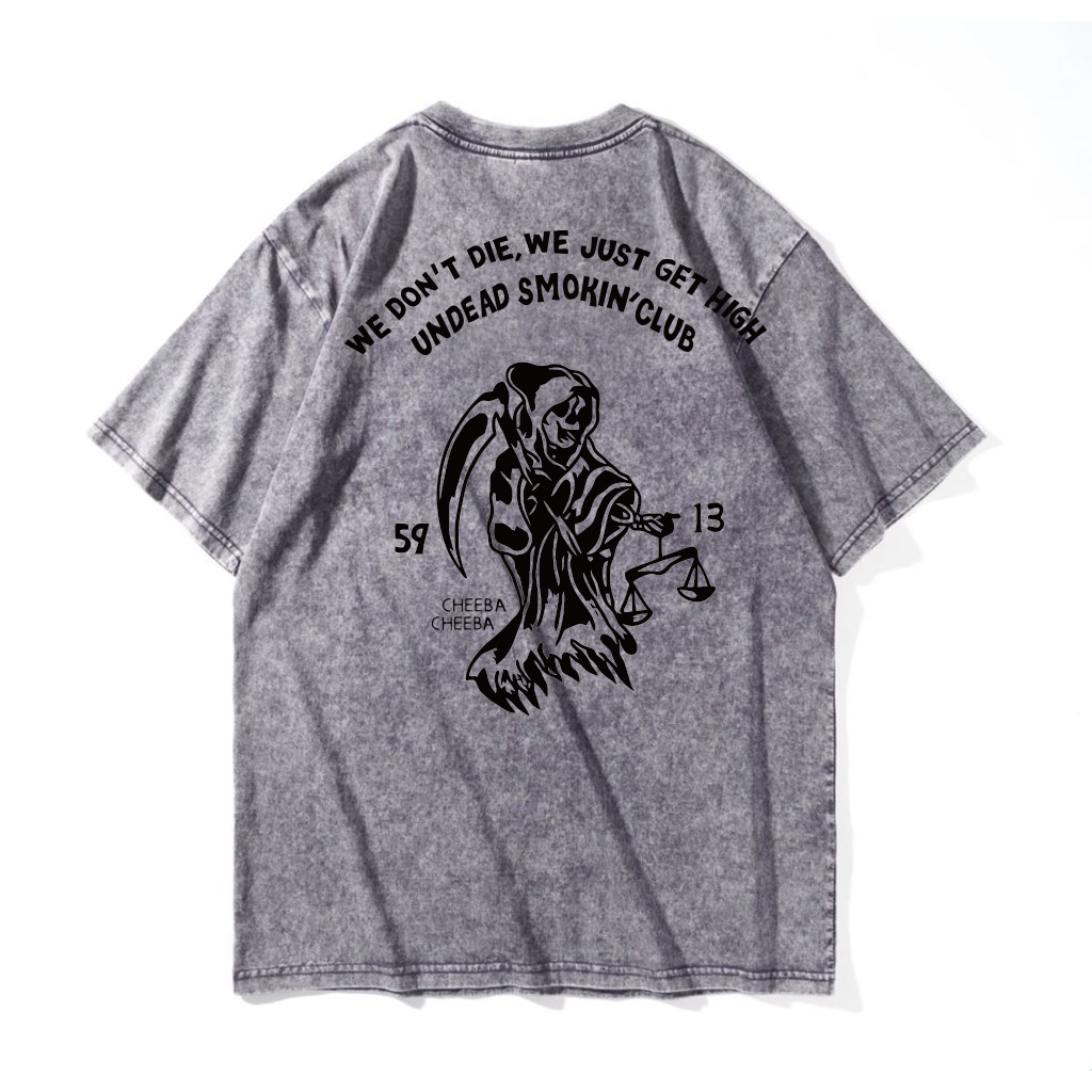 The ZeitStitch Afterlife Scales Club Mineral-Wash Tee is a study in sharp contrasts: mortality and mischief, reverence and rebellion. Center back, a spectral reaper materializes in crisp linework—scythe poised, scales lifted—framed by arched club typography and small numeral callouts that read like insider insignia. The composition borrows from old-school flash sheets and outlaw patches, then cleans the lines for a contemporary, gallery-ready read. From across the room it’s bold and unmistakable; up close, the details—cloak folds, blade curve, balanced pans—reward a longer look.