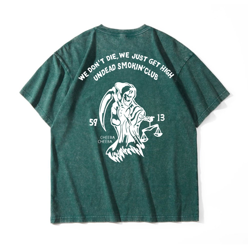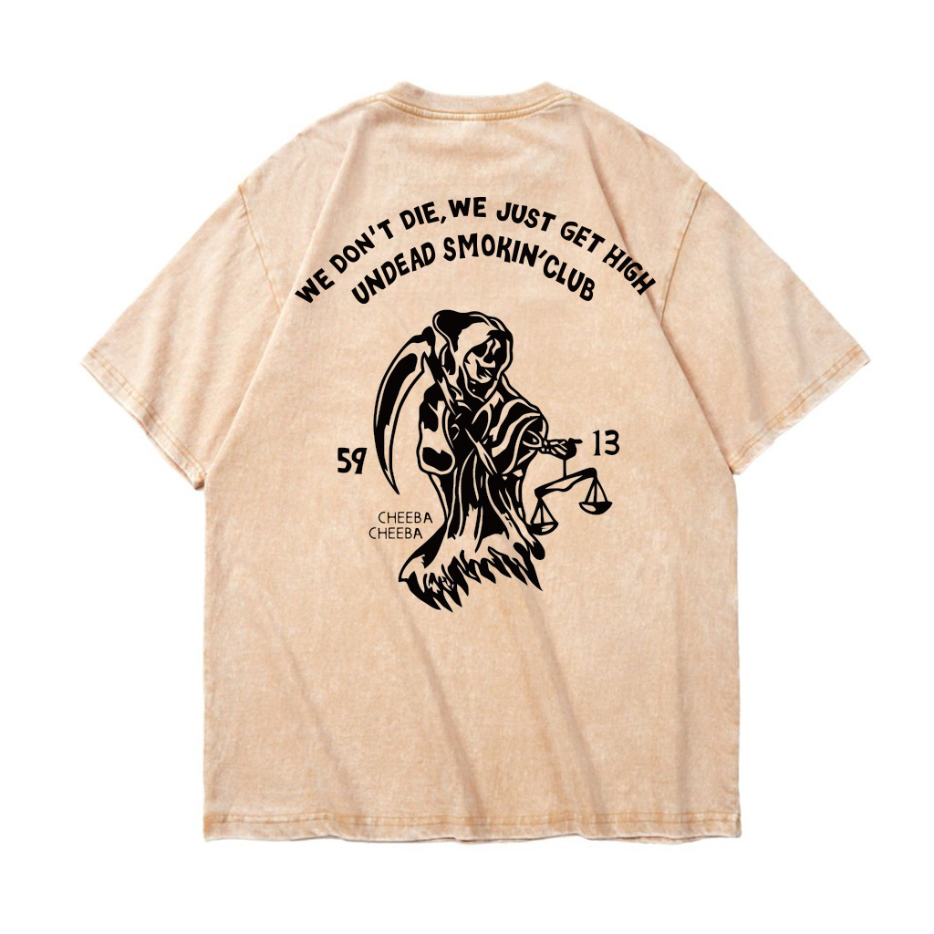 A hooded reaper—scythe in one hand, balancing scales in the other—sits beneath arched club lettering, like a biker patch crossed with tattoo flash. Printed large in clean, high-contrast linework, the motif turns memento mori into modern street iconography. The sun-softened mineral-wash base adds lived-in grit, so it feels like a favorite from day one—rebellious, restrained, and effortlessly styled with denim, cargos, or tailored trousers.
