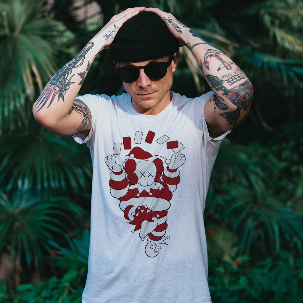 The ZeitStitch Crimson Maw Skull-Badge Tee distills rebel energy into a single, punchy emblem. At the core, a crisp skull-and-crossbones anchors a crimson field. Around it, a ring of rounded “teeth” and a heavy black border create the look of a circular bite mark—equal parts danger symbol and pop graphic. The composition is symmetrical, deliberate, and striking from a distance; up close, the simple geometry keeps it refined.