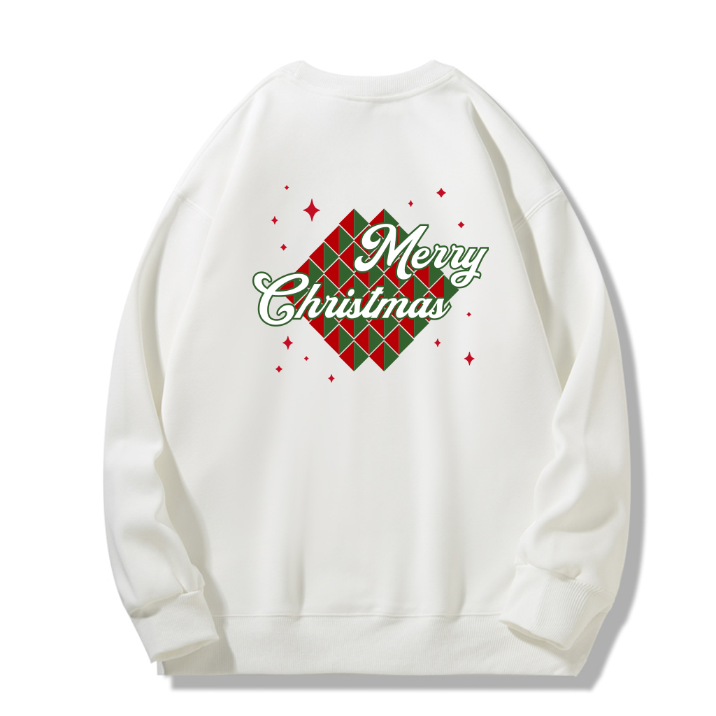 The artwork makes a modern salute to tradition: a diamond-shaped argyle rendered in festive crimson and evergreen, scattered with little starbursts, and overlaid with a sweeping “Merry Christmas” script. The front stays clean and minimal to keep the silhouette refined, while the full-back graphic turns every walk-by into a moment of cheer. Choose classic black for vivid contrast or winter-white for a snow-soft look—either way, the print stays the hero.