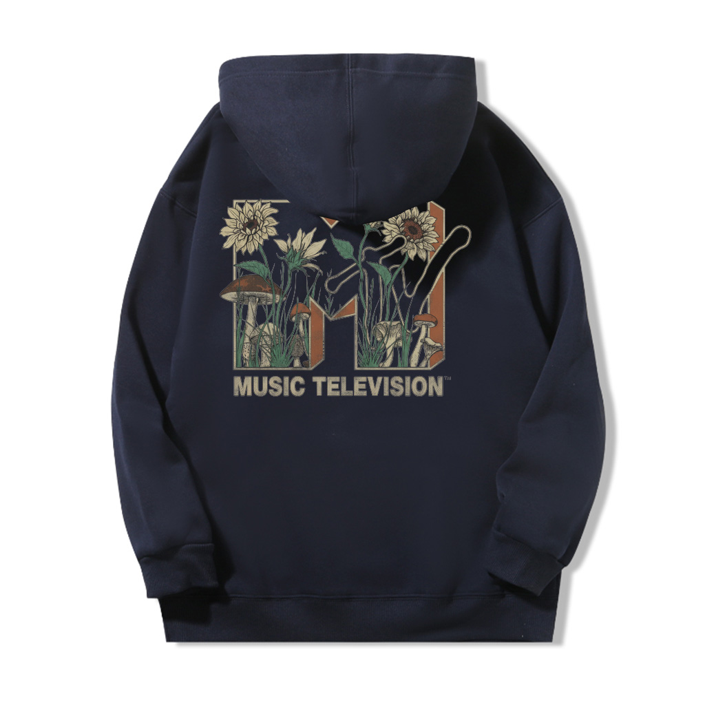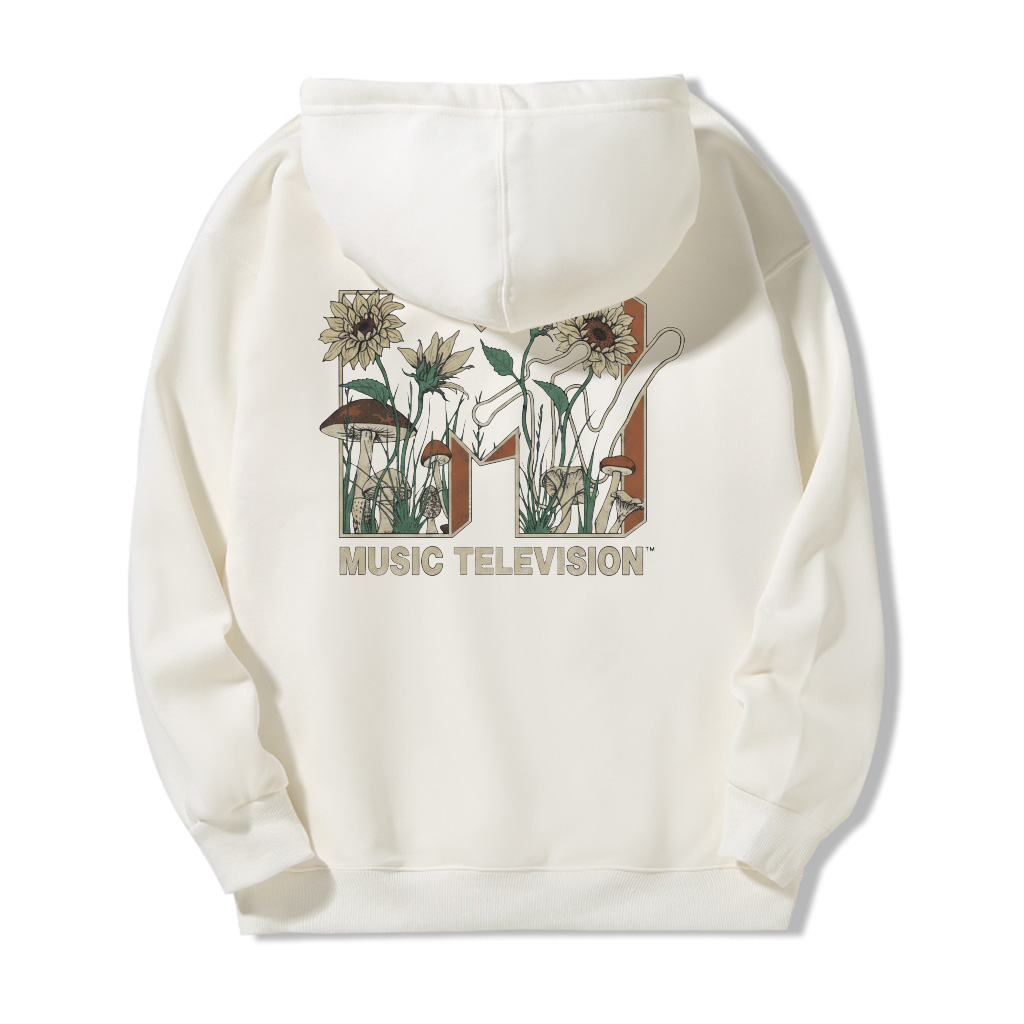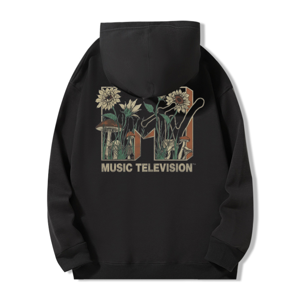 The ZeitStitch MTV Bloomwave Backprint Hoodie is an invitation to breathe, create, and move in your own rhythm. Reimagining the legendary MTV logo with organic motifs — blooming sunflowers, forest mushrooms, and earthy tones — this piece turns the energy of sound into a quiet celebration of growth and self-expression.