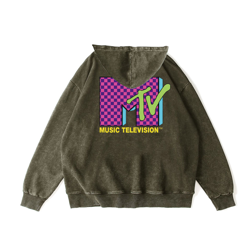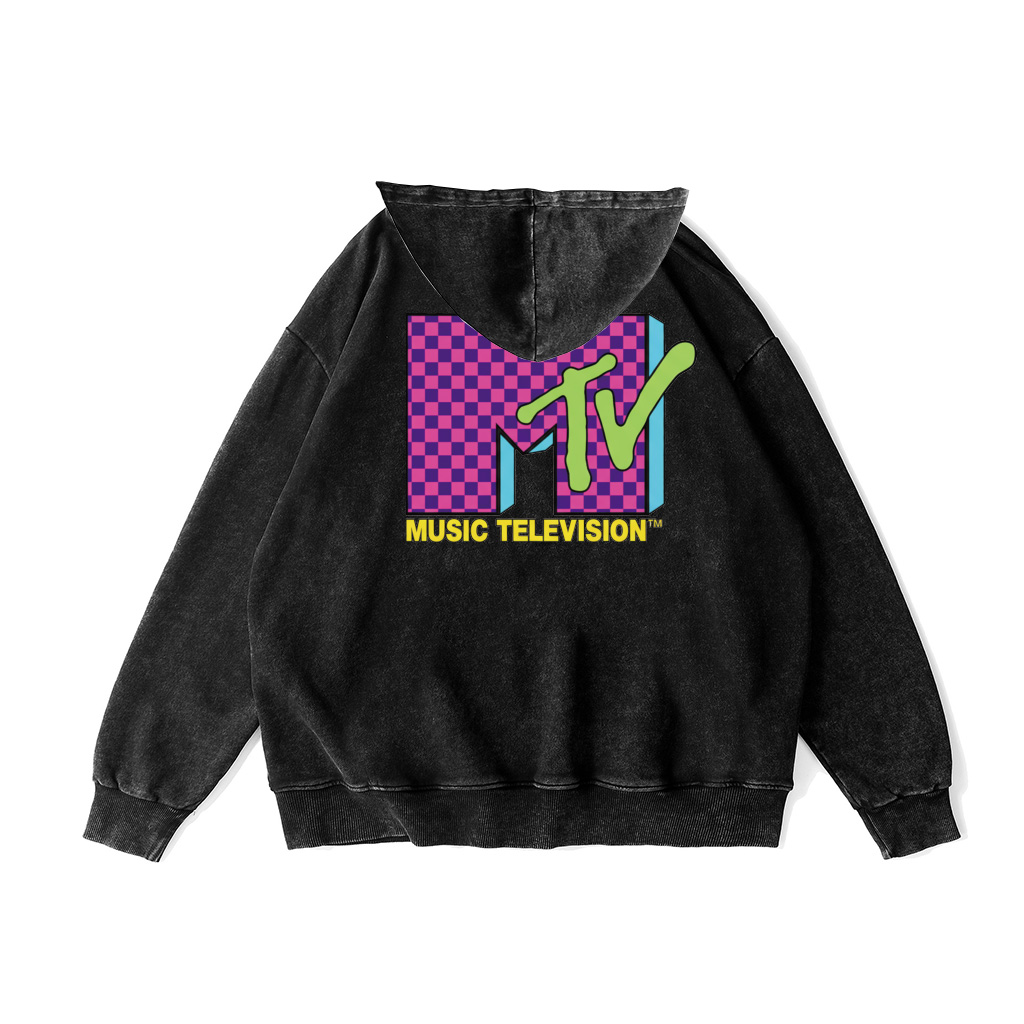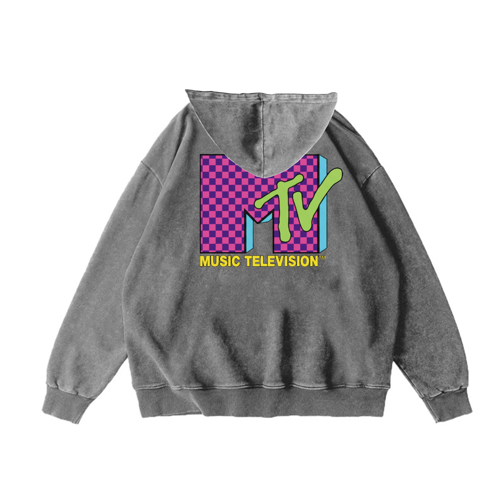 Turn comfort up to eleven. The ZeitStitch Neon Check MTV Vintage-Wash Hoodie celebrates the instant when music, screens, and youth culture fused into a single, joyful language. Its oversized back graphic is the hook: a magenta checkerboard “M” that nods to dance-floor tiles and early pixel grids; a lime-green “TV” swipe that feels hand-painted and kinetic; clean cyan drop-shadows that add dimension; and the punchy yellow “MUSIC TELEVISION” wordmark to land the final beat. It’s retro at heart yet crisp in execution—readable from across the room and unmistakably fun.